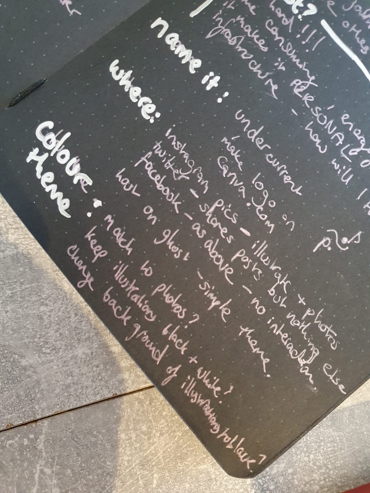 I selected my finest notebook - black paper (yes, really) with silver-tipped edges, a soft emaculate cover. The notebook I dare not write in, because it's so pretty and expensive. In my hand, a bold silver pen, metallic, the kind you use to write Important Titles.